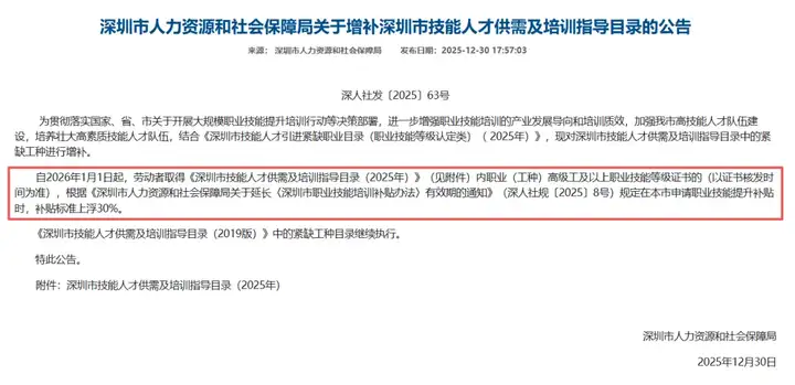 另外,人工智能训练师被纳入《深圳市技能人才供需及培训指导目录(2025年)》,补贴按照上浮30%的标准执行。所以,2026年1月1日开始,深圳地区报考人员拿证后符合条件最高可申请补贴3120元。(广州、佛山预计继续实施补贴上浮30%。)