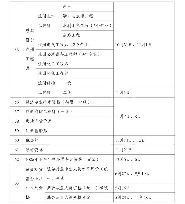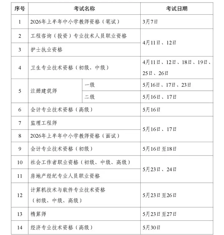 为切实做好专业技术人员职业资格考试规划与管理工作,方便广大专业技术人员参加职业资格考试,经征求有关部门同意,现就2026年度专业技术人员职业资格考试工作计划及有关事项通知如下: